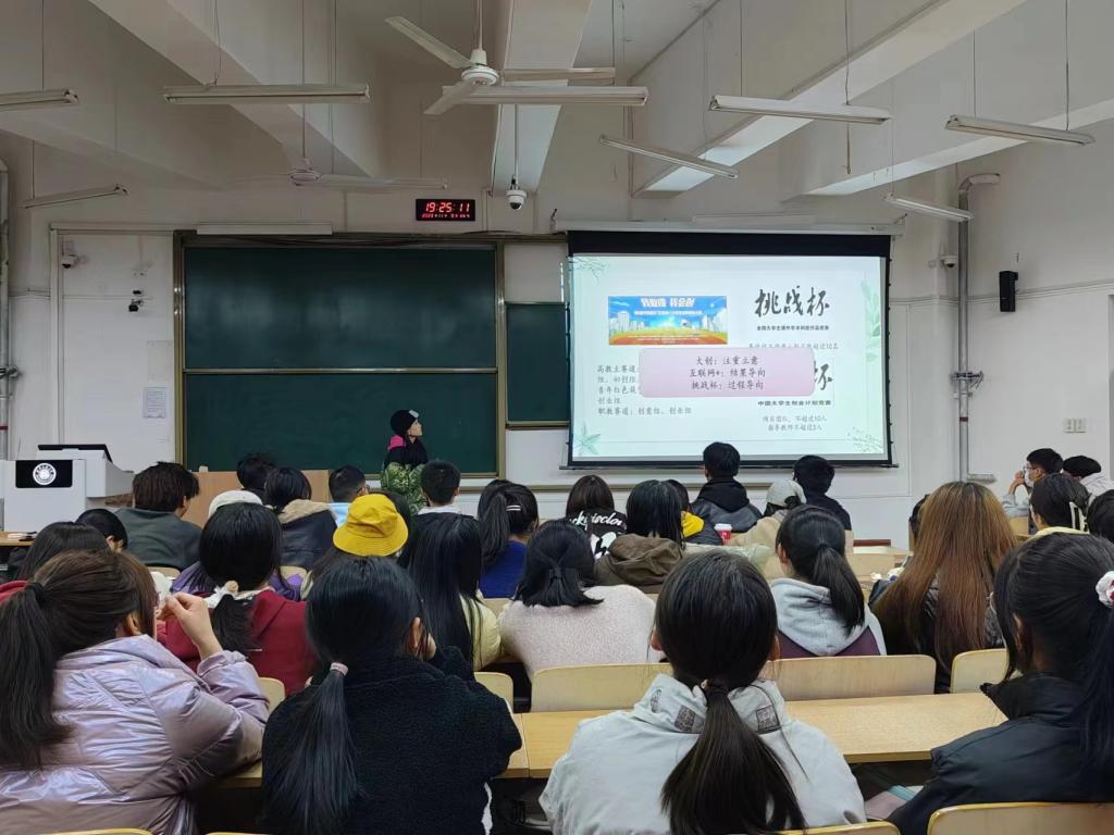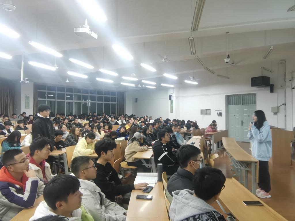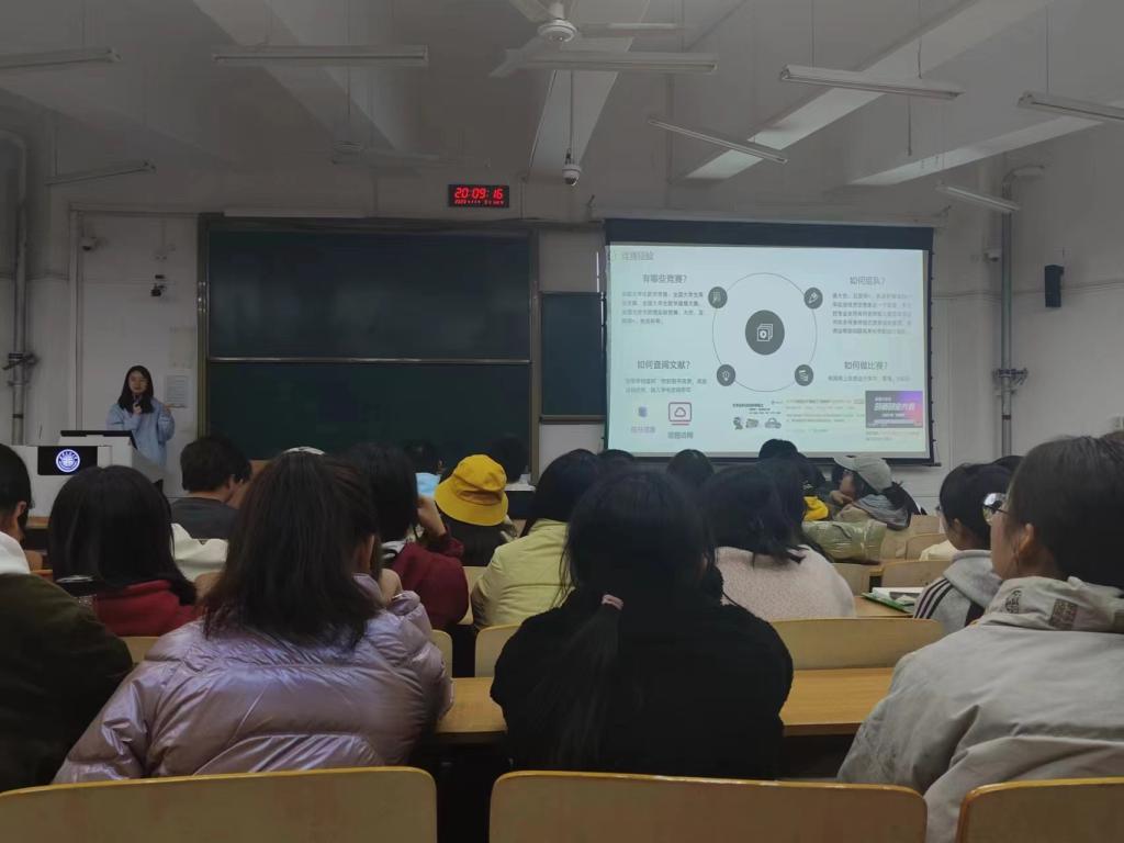 会上,刘嫚从学习、竞赛、工作等几个方面给新生们讲解,着重介绍了自己科创方面的经历与经验,包括大创、挑战杯、互联网+、中美青年创客、数学建模、物理实验等竞赛报名时间、参赛形式、团队搭建、申报流程,帮助同学们了解科创竞赛相关知识,明晰从立项到结项的全过程。之后,刘嫚介绍了发明专利的撰写要点、申请和授权流程,以及如何填写申报书、优化项目PPT,彰显项目特色。她鼓励同学们要勇于突破、敢于创新,专注于一个方向、一个领域,将小的东西做好做细,积极参与到创新创业活动和各类学科比赛中。