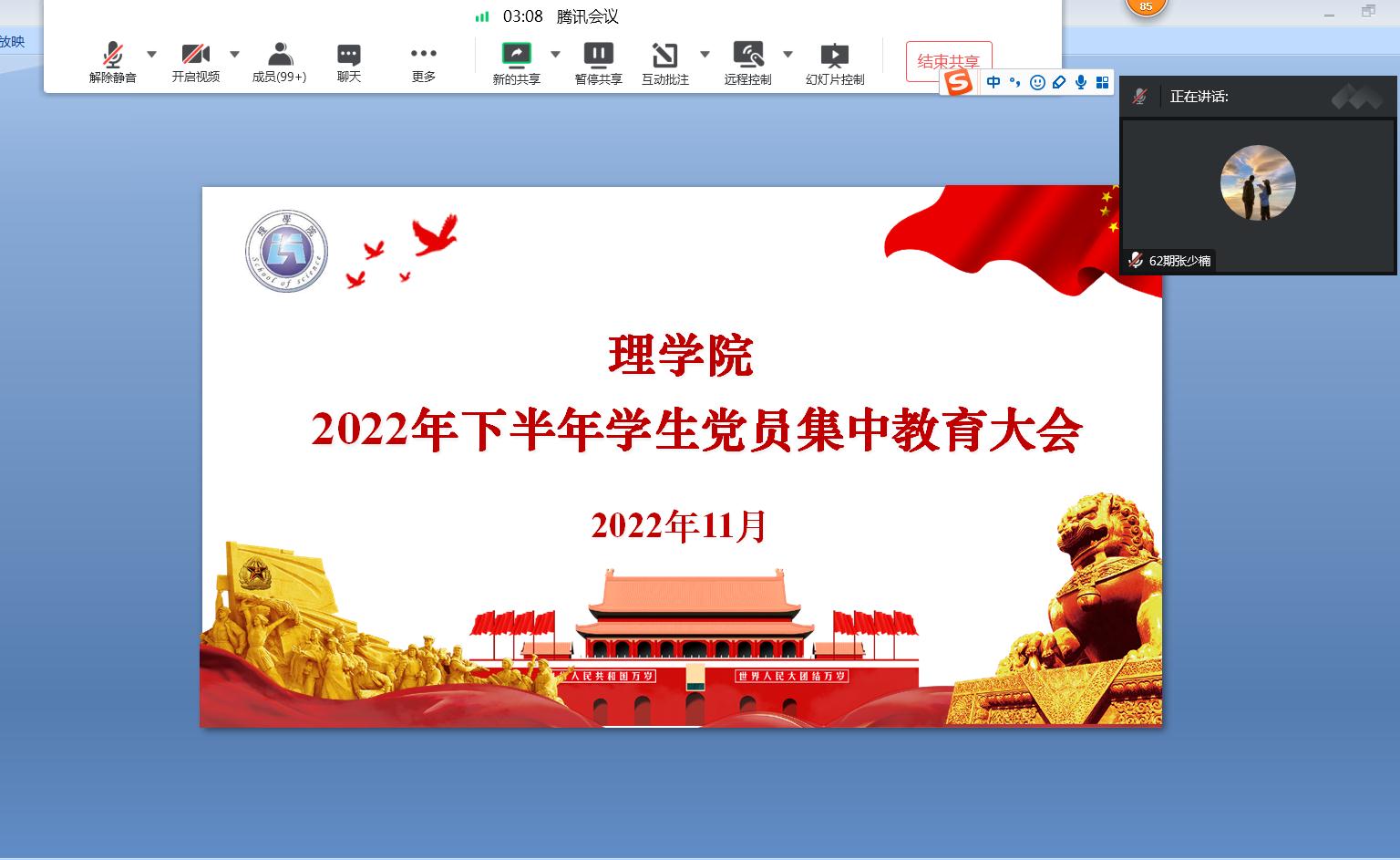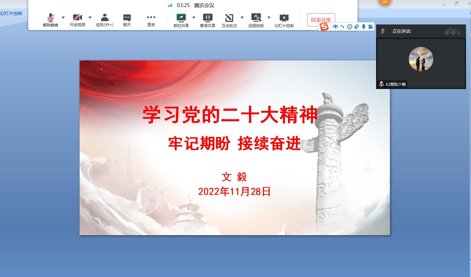 会上,文毅以《牢记期盼 接续奋进》为题进行了党课讲授,带领同学们集中学习党的二十大精神。他从二十大的大会主题、主要内容、重要意义等几方面进行了讲解。着重就报告中关于青年工作的重要论述和对青年的殷切希望进行了细致阐述,从把牢“有理想”首要标准、突出“敢担当”时代要求、锤炼“能吃苦”坚毅品格、弘扬“肯奋斗”光荣传统等几方面对同学们提出了具体要求,希望参会党员在新时代新征程的奋进道路上深刻领悟“两个确立”的决定性意义,更加自觉地增强“四个意识”、坚定“四个自信”、做到“两个维护”,发扬革命加拼命的精神,砥砺实干加苦干的行动,引领更加广大的青年听党话、跟党走,怀抱梦想脚踏实地,敢想敢为善作善成,在全面建设社会主义现代化国家、全面推进中华民族伟大复兴的新征程上,书写无愧于历史、无愧于人民的崭新青春篇章。