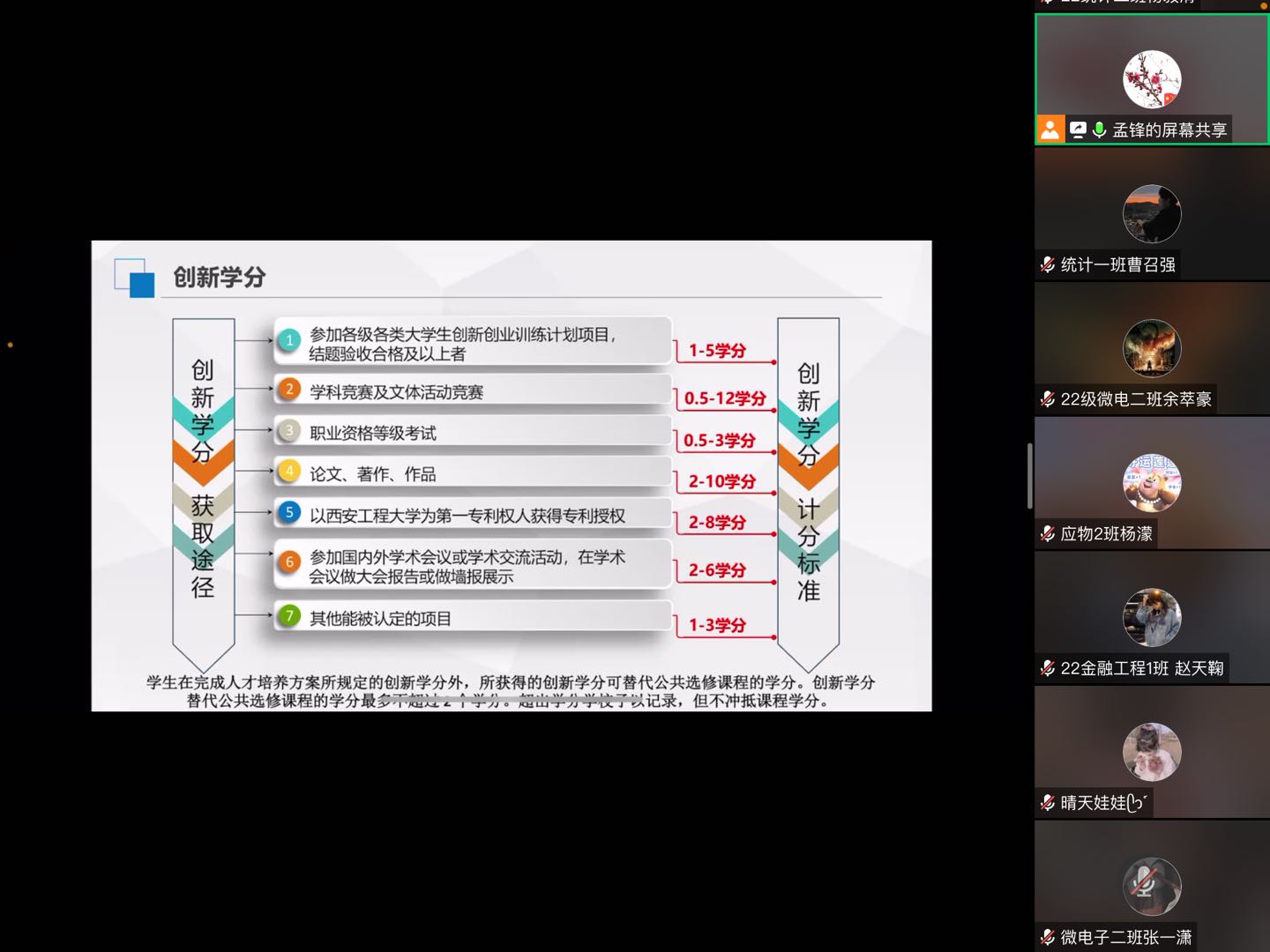 学籍管理规定及创新学分管理办法宣讲中,孟峰从入学与注册、考核成绩、学籍处理、学位授位条件、考试管理规定等方面做了细致的讲解,并结合自身学习工作经历,提醒同学们要努力养成自觉的学习习惯,制定合理的学涯和人生规划,尽快在学习方法、生活方式等方面进行角色调整,快速适应新环境、融入新氛围、投入新生活。张紫娟就创新学分进行了详细讲授,鼓励同学们在新学期认真学习,保质完成学习任务。