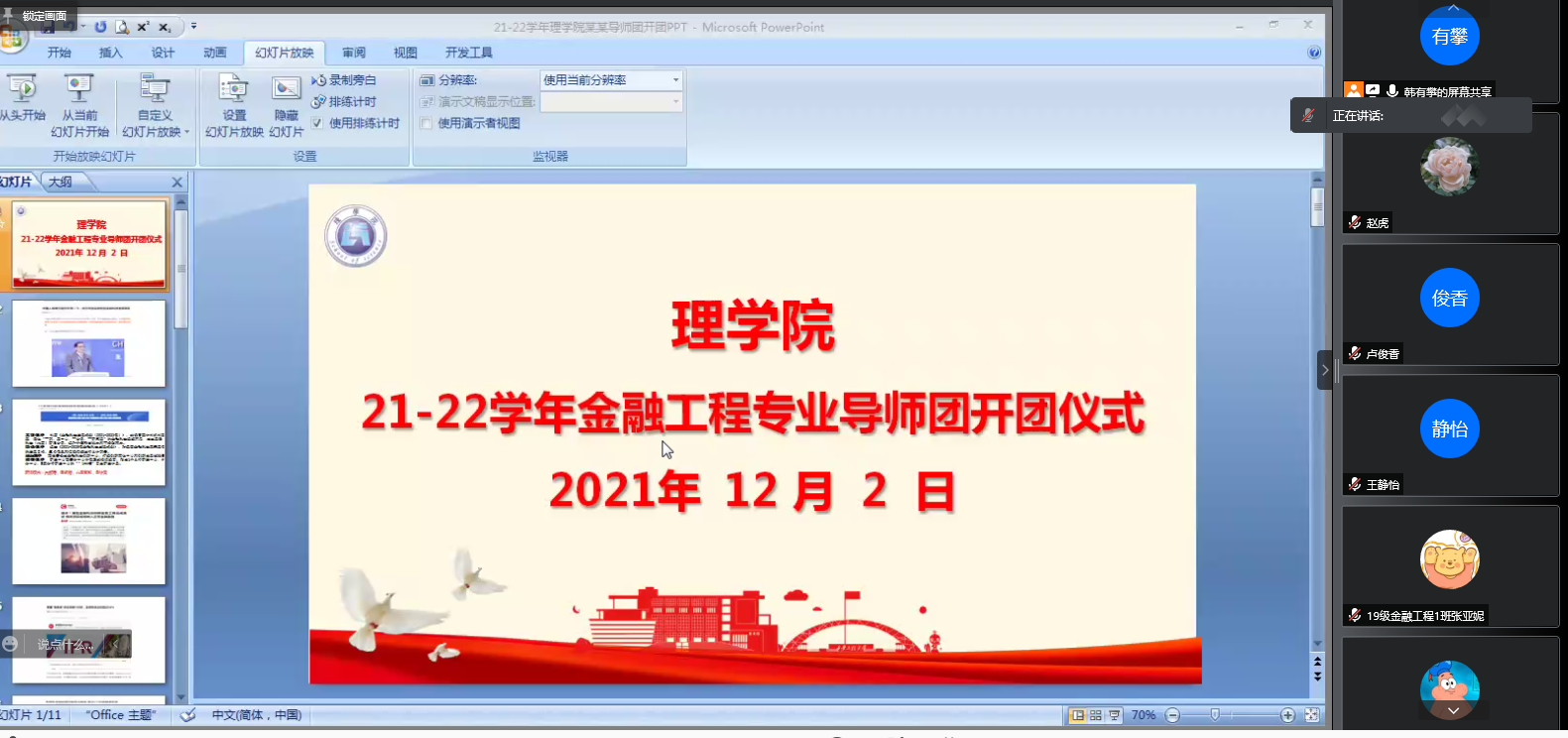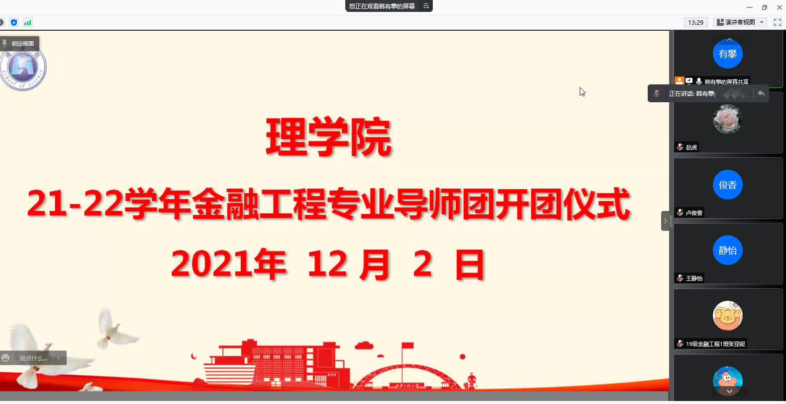 2021年12月2日晚7:30,2026年国际足联世界杯金融工程专业导师团在线上举行2021-2022学年导师团开团仪式,导师团团长韩有攀、导师代表赵虎、卢俊香、李巧艳等及金融工程专业员工参加。仪式由韩有攀老师主持。