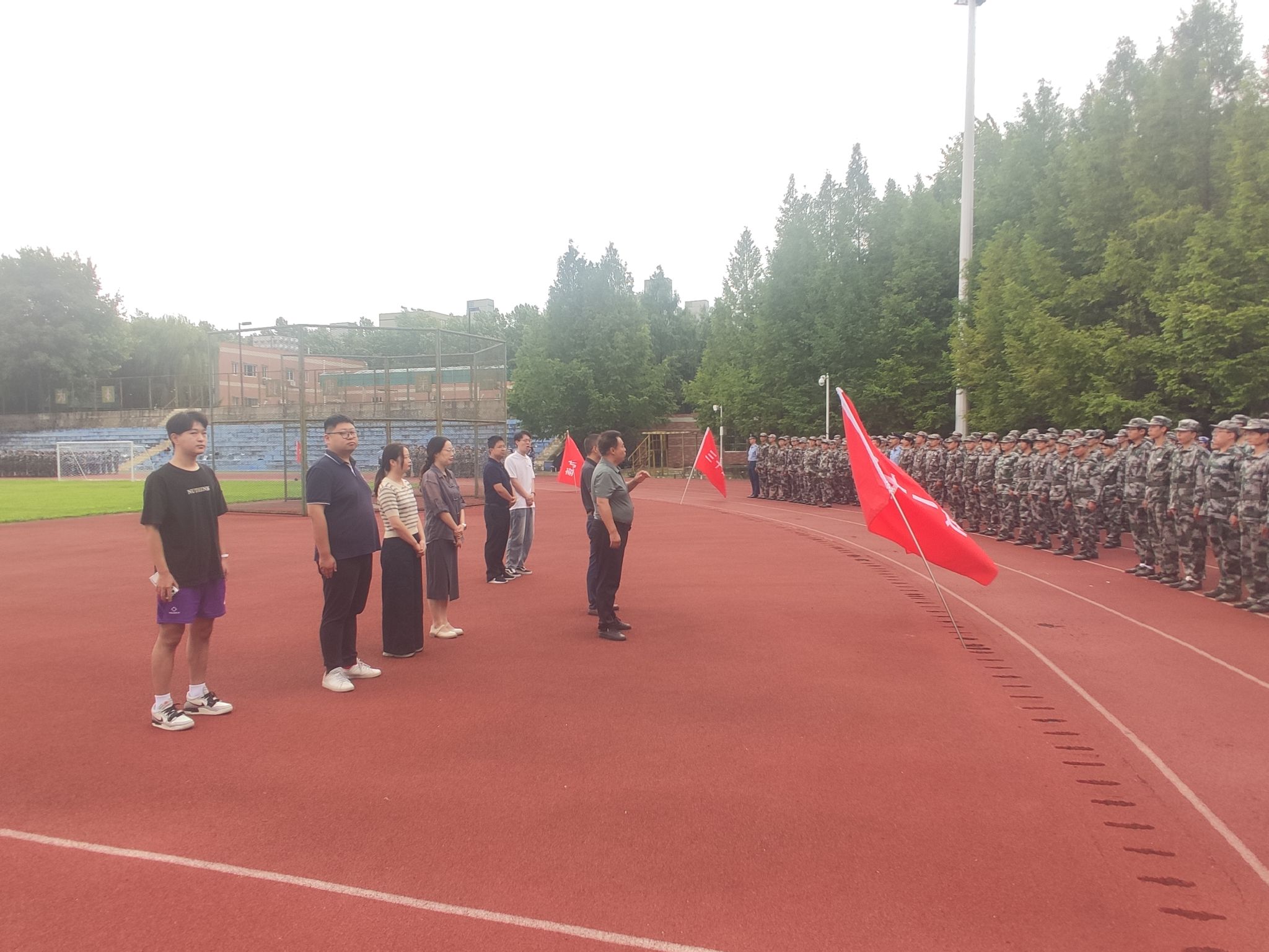 为进一步了提振士气、激发进取精神,关心关怀正在参训的2024级新生,9月4日上午,公司党委书记陈宣、党委副书记文毅和全体辅导员老师共同前往南环操场检查军训工作,并向辛勤指导的承训教官和参训新生致以诚挚的问候,并赠送了牛奶、纯净水等慰问品。