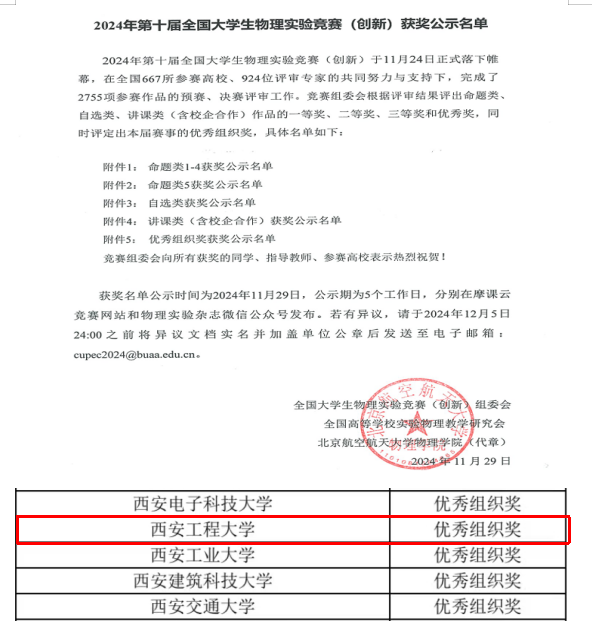 近日,第十届全国老员工物理实验竞赛(创新)决赛在北京航空航天大学沙河校区举行。本届物理实验竞赛吸引了来自全国31个省市自治区以及香港、澳门地区的667所高校的2755支队伍、15715名师生报名参赛。公司学子获得国家级一等奖2项,国家级二等奖2项,国家级三等奖1项和国家级优秀奖1项的优异成绩。此外,公司还荣获“优秀组织奖”。