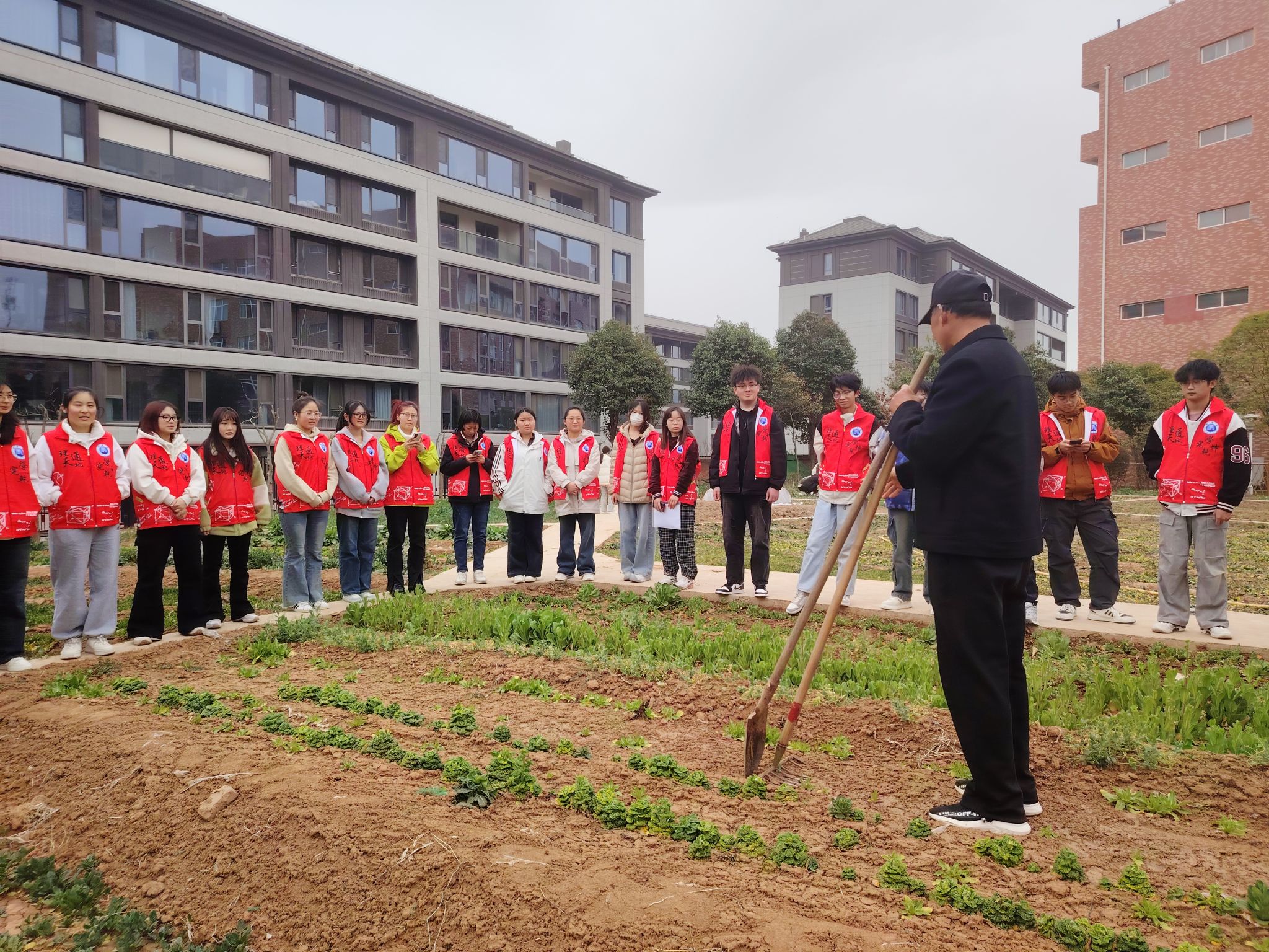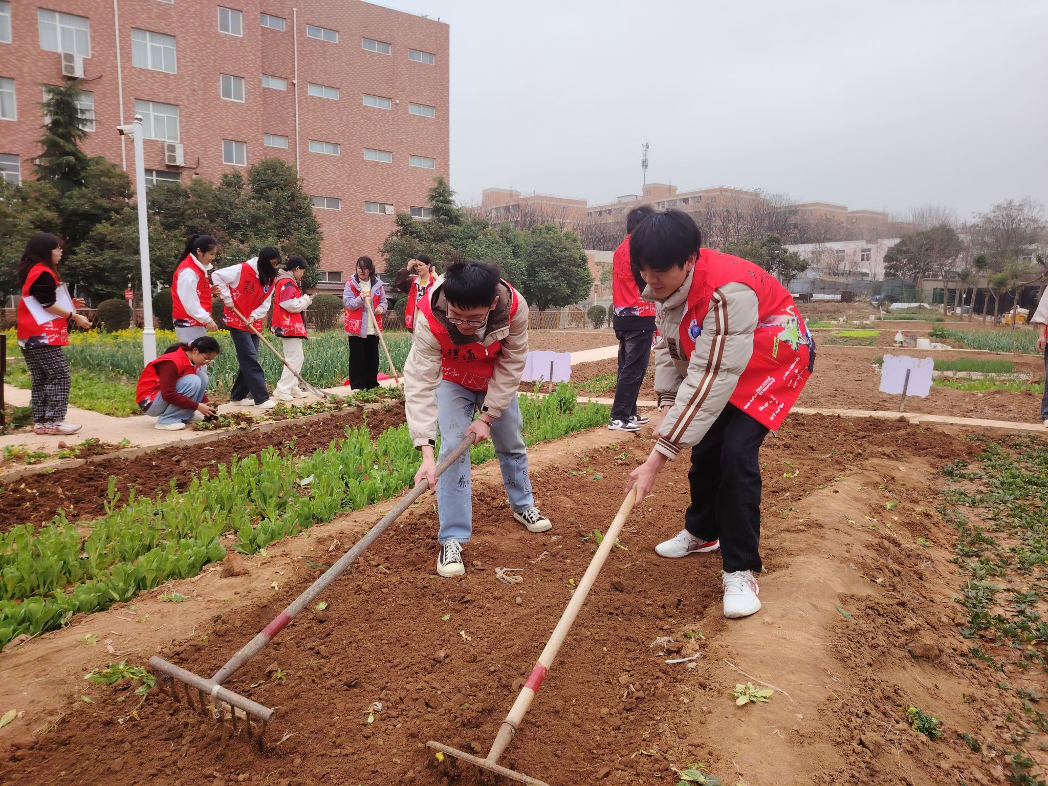 活动开始前,同学们有序领取耕作工具,花房管理员师傅详细介绍土地的基本情况、花卉生长特性、栽培技巧以及日后养护知识,并带头示范如何使用铁锹、锄头、耙子等农具。随后同学们分为若干小组,正式开启种植之旅。从拔除杂草、松土犁地到平整土地、播种浇水,整个过程其乐融融,充满欢声笑语,大家各司其职,热情饱满,干劲十足,争相体验春耕之乐。历经2个多小时的辛勤耕作,同学们顺利完成了花种播撒的任务,不仅为公司耕读小园“责任田”带来了活力与生机,同时也展现了公司学子团结协作的精神和积极向上的风貌。