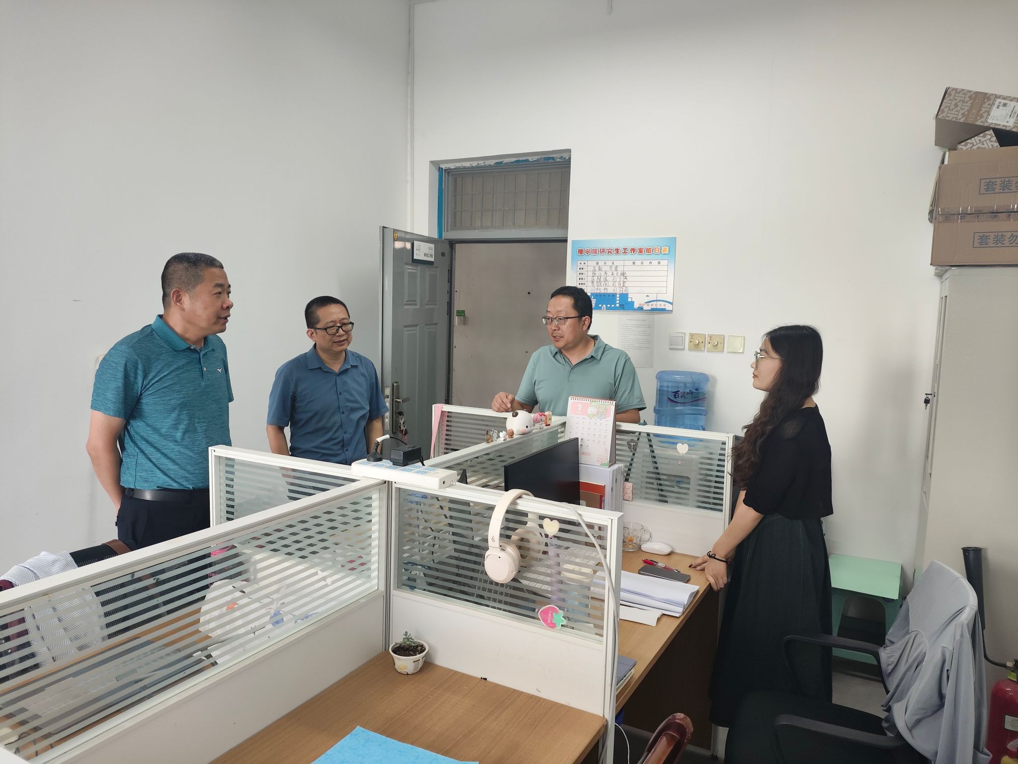 在研究生工作室,检查组对工位使用情况、用电情况、消防安全、工位布局、环境卫生等进行了认真检查,同假期留校同学进行了深入交流,叮嘱留校同学务必深刻认识安全工作的重要性,同时注意工位卫生,保持良好的卫生环境,共同营造舒适的科研环境,勉励大家要珍惜时光、认真钻研,努力提升自身科研能力。