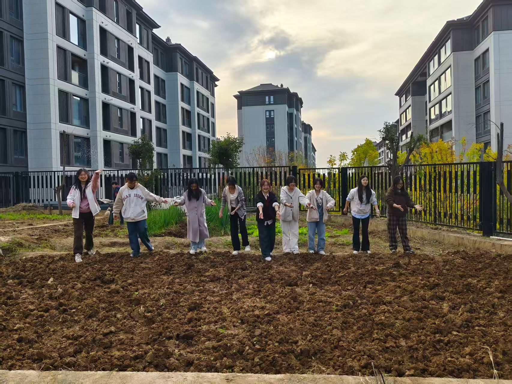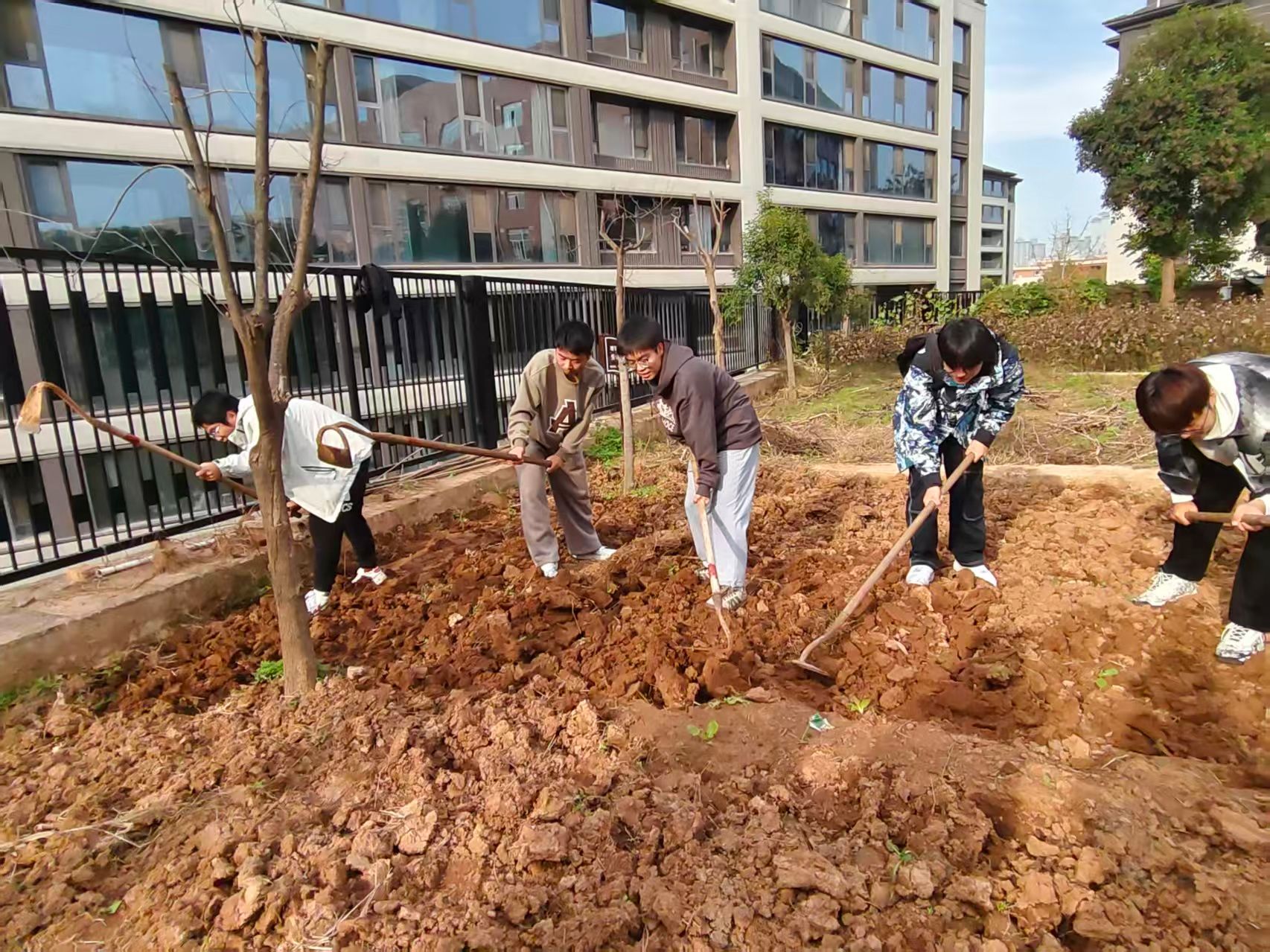 活动中,花房师傅向同学们详细介绍油菜花的生长特性、栽培技巧及各种农具操作规范并现场进行耕地劳动技巧的示范。随后,同学们以小组为单位戴上手套、手持铁锹、锄头、铁耙等农用工具有条不紊地投入到劳动中。经过清除田地杂草、翻耕平整土地、播撒油菜籽、施用基肥和覆盖表土等农耕实操,顺利完成了播种油菜花的任务。尽管汗水湿透了衣衫,泥土沾满了裤脚,但现场不时传出欢声笑语,气氛热烈而融洽,不仅为公司耕读小园“责任田”带来了活力与生机,大家也切身感受到农耕劳作的艰辛与乐趣。