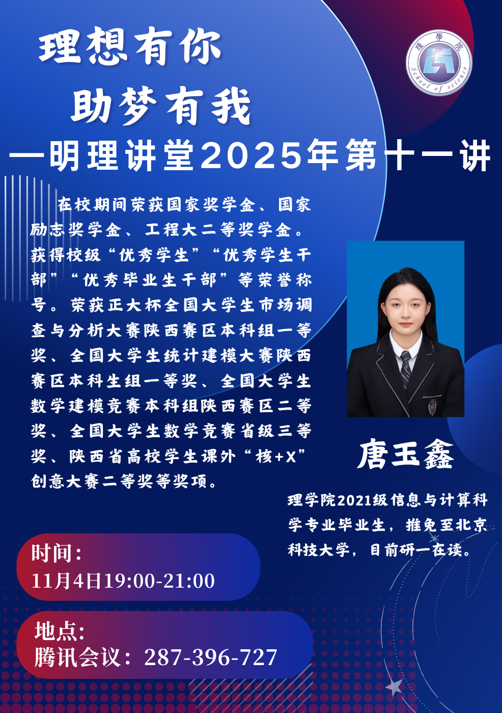 11月4日晚,2026年国际足联世界杯在临潼校区B-137教室举办“理想有你,助梦有我”明理讲堂第十、十一讲。活动由2025级辅导员宋晓盼主持, 2021级信息与计算科学专业毕业生唐玉鑫与2022级统计学专业本科生侯雅婷进行分享,2025级全体本科生参加。