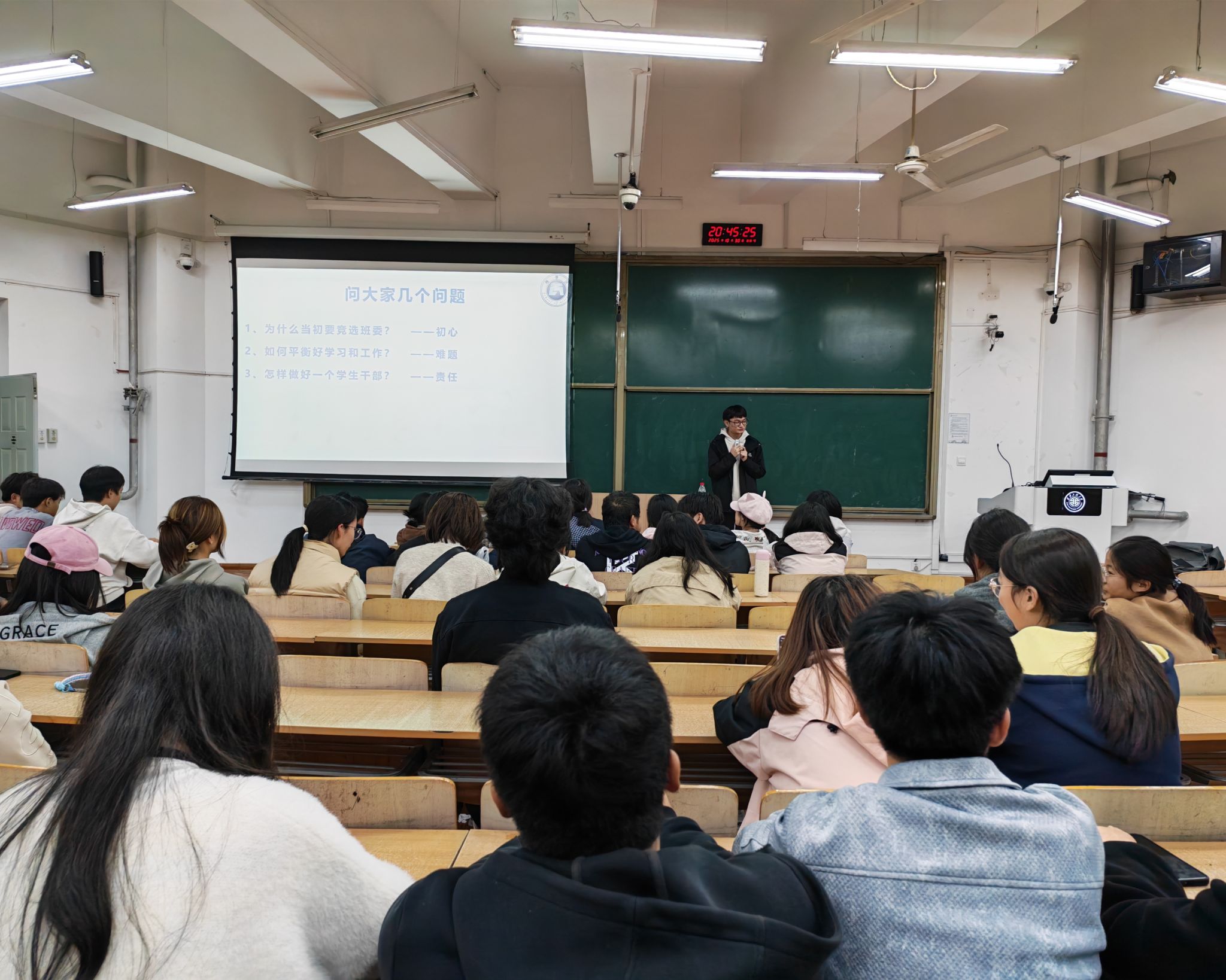 在经验分享环节,2023级数学与应用数学1班班长邢艺耀结合自身担任班委和获得国家奖学金的经历,分享了高效处理班级事务、平衡学业与工作的方法。2022级金融工程2班班长熊佳彧从学科竞赛与班级管理等方面,为新生班干部提供了实用建议与成长路径参考。