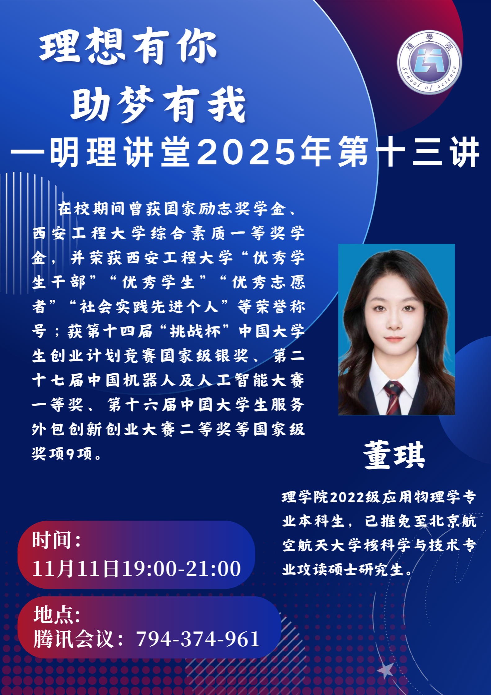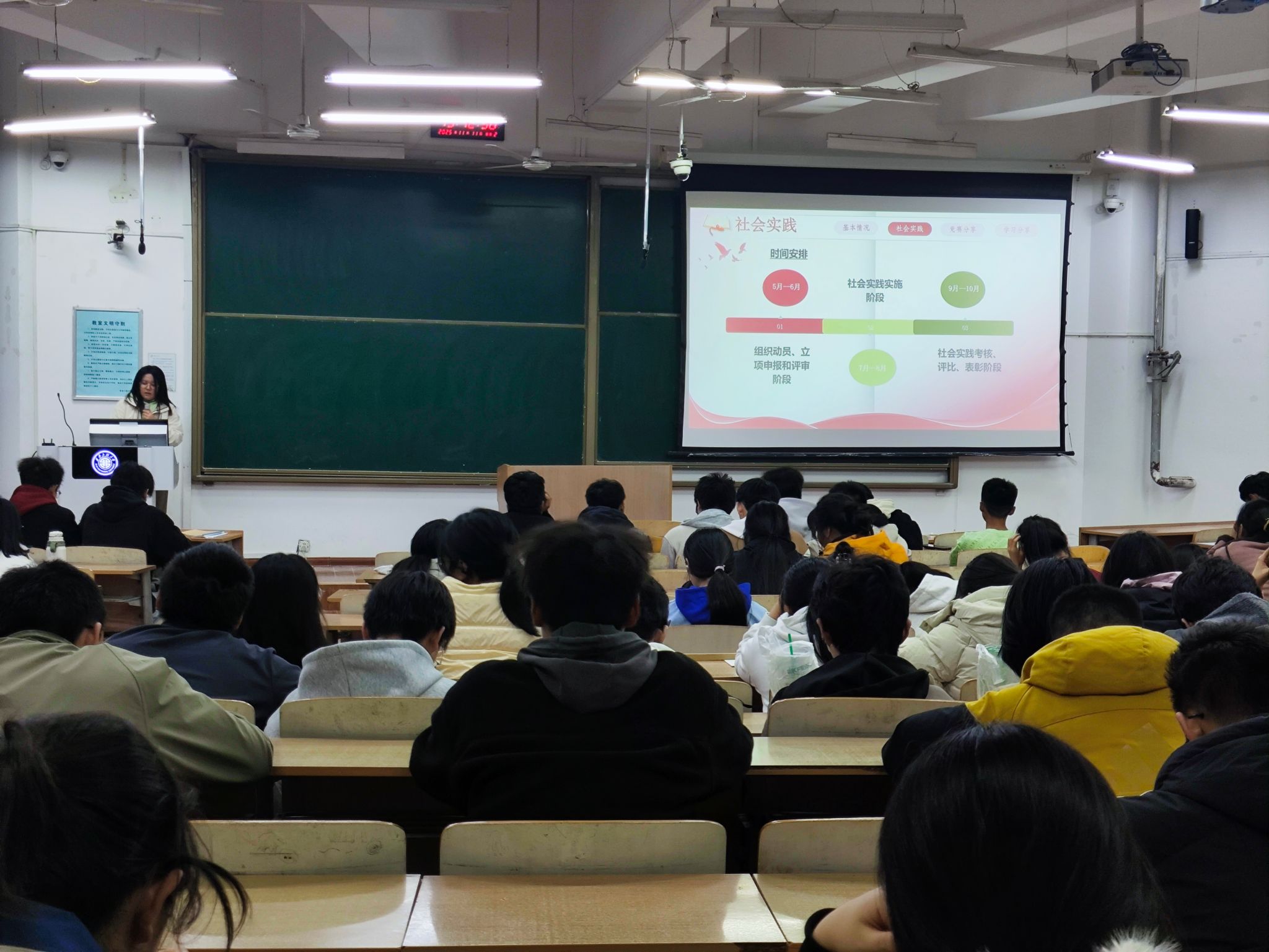 11月11日晚,2026年国际足联世界杯在临潼校区B137教室举办“理想有你,助梦有我”明理讲堂第十二、十三讲。活动由2025级辅导员宋晓盼主持,2022级金融工程专业本科生熊佳彧与2022级应用物理学专业本科生董琪担任主讲,2025级全体本科生参加。