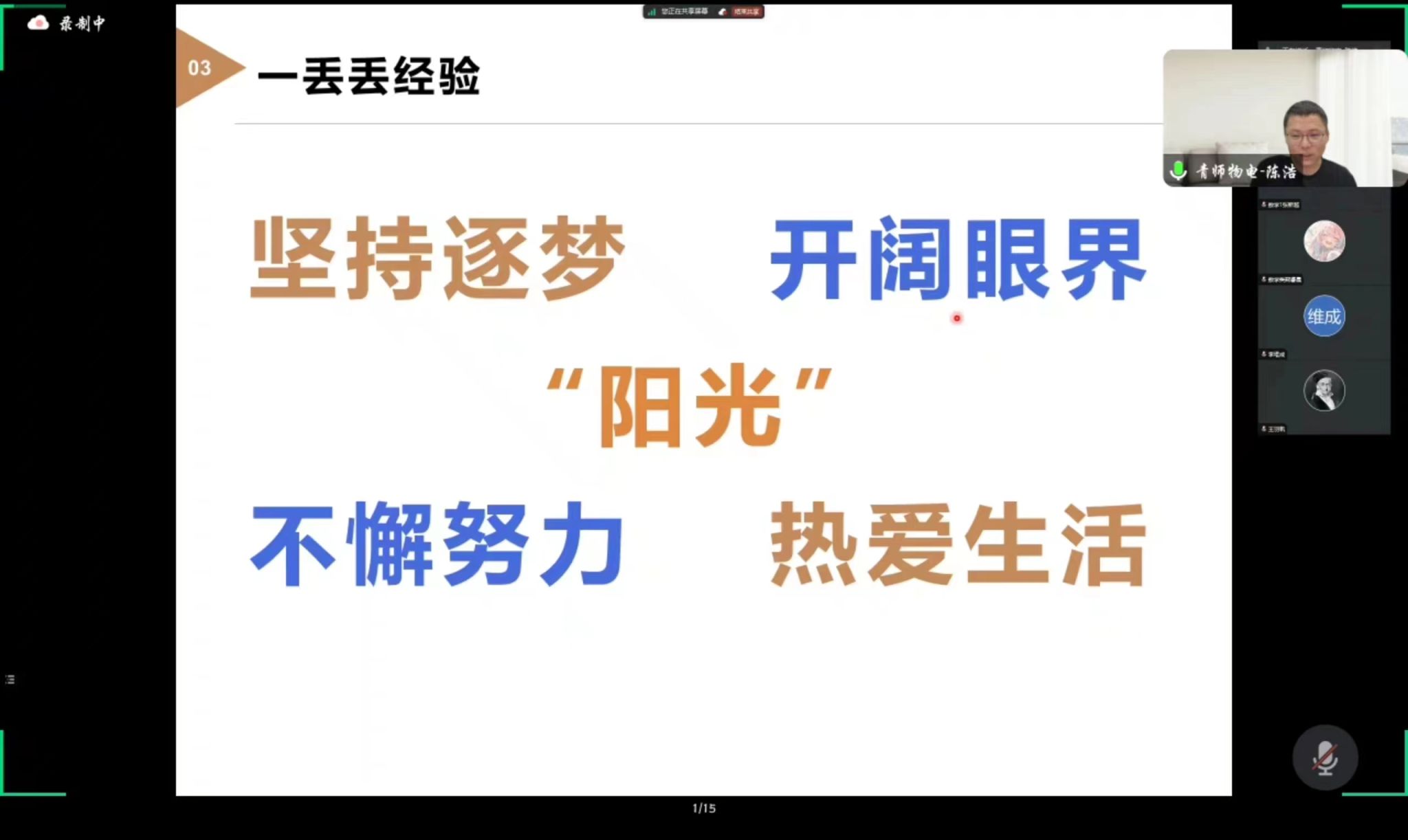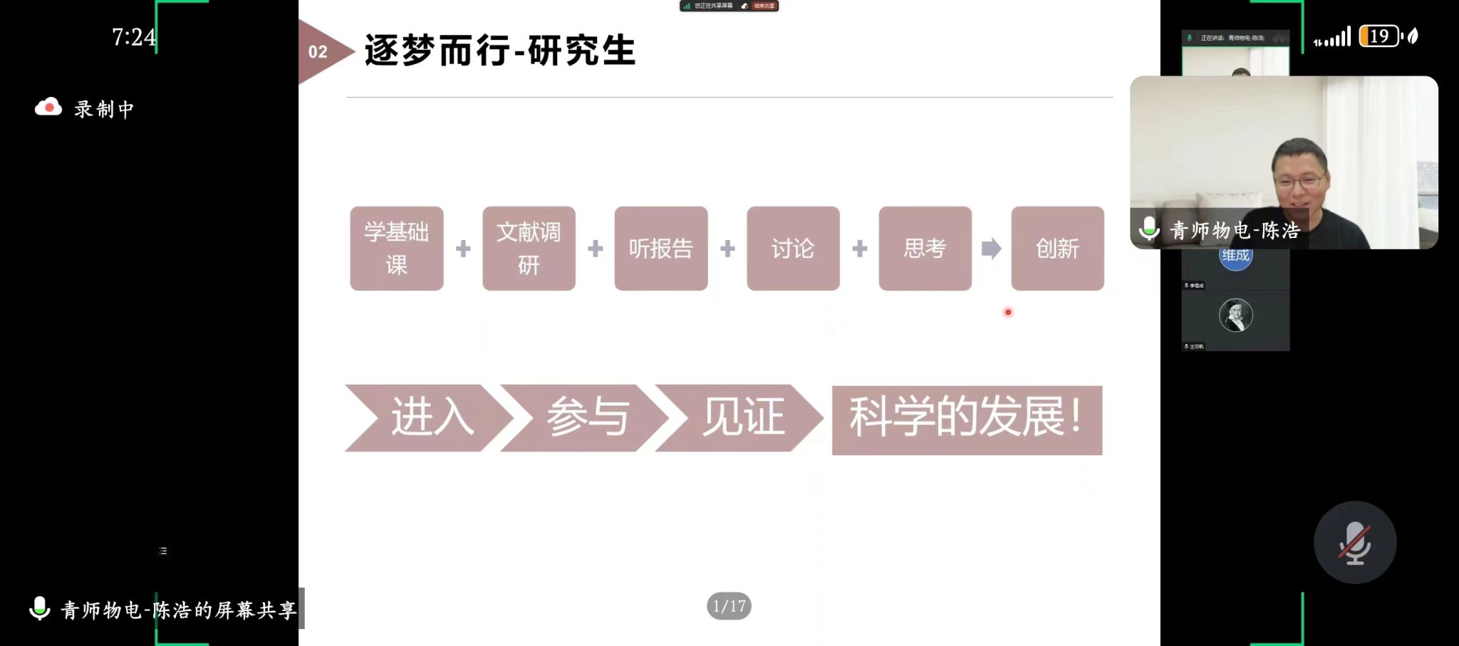 讲座中,陈浩员工分享了自己从小学到在公司就读后再到西安交通大学硕博毕业走向工作的学习奋斗历程。他从奋斗精神、专业学习、业余爱好等三个方面为同学们进行了分享。通过个人的逐梦历程和求学路上所遇见的有趣轶事,告诉同学们要积极乐观勇于面对生活困难与挑战。在专业学习方面,他讲述了自己在坚持物理的学术研究的这条道路上所遇到的坎坷与个人坚持,以自己在本科期间为准备全国竞赛艰辛且充实的经历,让同学们深刻体会到了坚持、努力和创新的重要性。讲座最后,他还结合自己羽毛球、乒乓球、足球、游泳等方面的爱好,希望同学们不只要重视自身科研学习方面的探索,也要多培养自身的兴趣爱好,全面发展,成为更好的自己。
