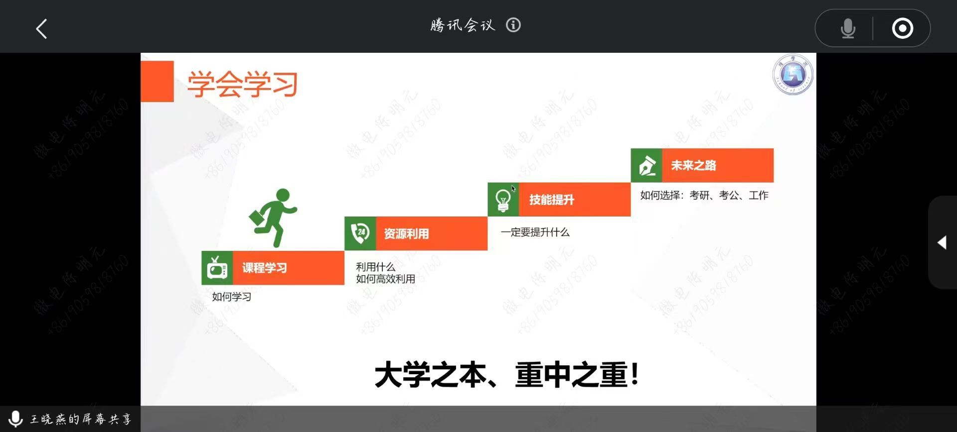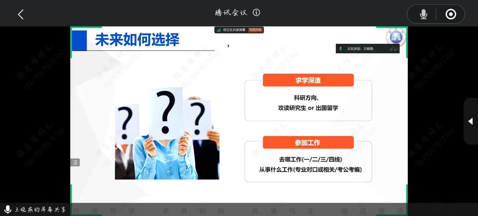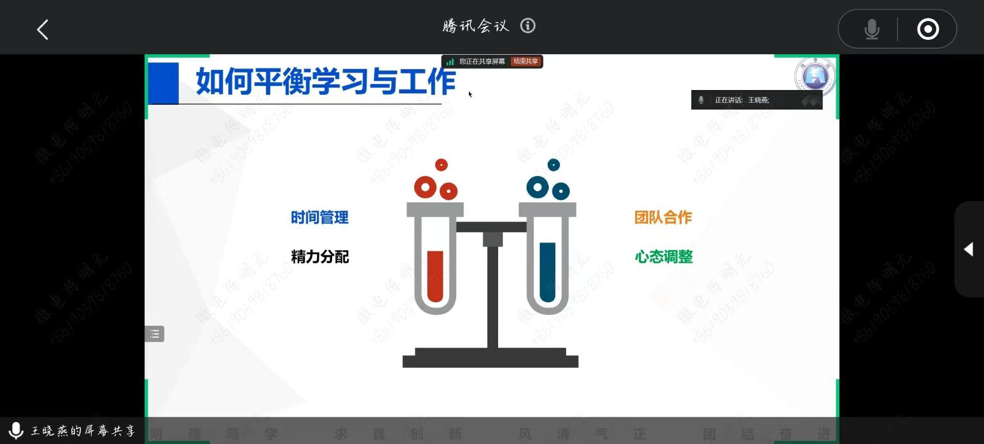 王晓燕在讲座中分享了自己的考研历程,从备考策略的制定、复习方法的选择到心态的调整,都进行了详细的介绍。指出要合理规划学业,平衡好课程学习、科研竞赛和员工工作之间的时间和精力,尤其是在跨专业考研时,要更好平衡本专业和跨考专业之间的关系,合理利用资源获取信息,强化自身学习。最后,她提醒同学们学业成绩是大学中最重要的部分,一定要学好专业课,提升专业能力。同时认真地规划好自己的目标分配好任务,将自己的知识运用到实际工作之中,通过科研实践,不断地提升自己的专业技能。