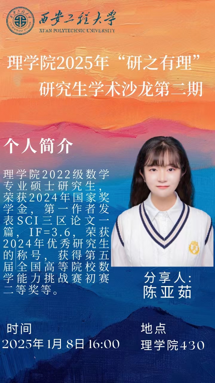 陈亚茹,女,2022级数学专业硕士研究生,荣获2024年国家奖学金,第一作者发表SCI三区论文一篇(IF=3.6),荣获2024年优秀研究生荣誉称号,荣获第五届全国高等院校数学能力挑战赛初赛二等奖等。