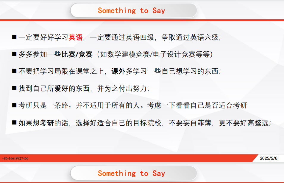 会上,李云号回顾了自己的考研历程。详细描述了备考期间的艰辛与坚持,从初次尝试的轻松态度,到备考顶级公司时的全力以赴,告诉大家考研需要需要高度的自主性和自控性;在分享研究生学段学习生活经历时,他通过为自己设定了清晰的努力方向,努力实现工作目标,再次强调了坚持学习的重要意义;在职场经历中,他为同学们分享了自己的行业前景及职场经验。强调,第一份工作应更看重学习和成长机会,尤其是研发类岗位对学历的较高要求。鼓励大家保持持续学习的态度。分享尾声,李云号寄语参加的同学们,要珍惜大学时光,努力学习英语和专业知识,积极参加各类竞赛以锻炼自己的实践能力。特别提醒微电子专业的同学,如果想从事集成电路相关工作,考研是一个重要的选择。同时,他也鼓励大家找到自己的兴趣所在,并为之付出努力。