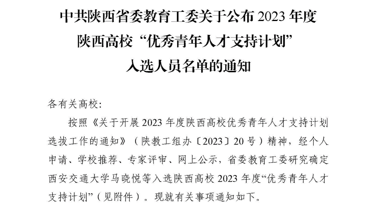 近日,陕西省委教育工委下发《中共陕西省委教育工委关于公布2023 年度陕西高校“优秀青年人才支持计划”入选人员名单的通知》(陕教工函〔2024〕175 号),公司教师韩小祥入选。陕西高校“优秀青年人才支持计划”的评选旨在进一步加强我省高校高层次人才队伍建设,加快提升高端人才储备,着力培养、造就一批青年学术骨干,构筑良好的人才发展梯队。“青年杰出人才支持计划”着眼于人才基础性培养和战略性开发,提升我省高教系统人才竞争力,采取定期选拔、年度考核、动态调整的模式,选拔和支持一批研发水平高、创新能力强、综合素质好、发展潜力大的优秀青年学术技术人才,为我省实现追赶超越提供强有力的人才支撑和智力支持。(撰稿:韩小祥 审核:刘玉森)