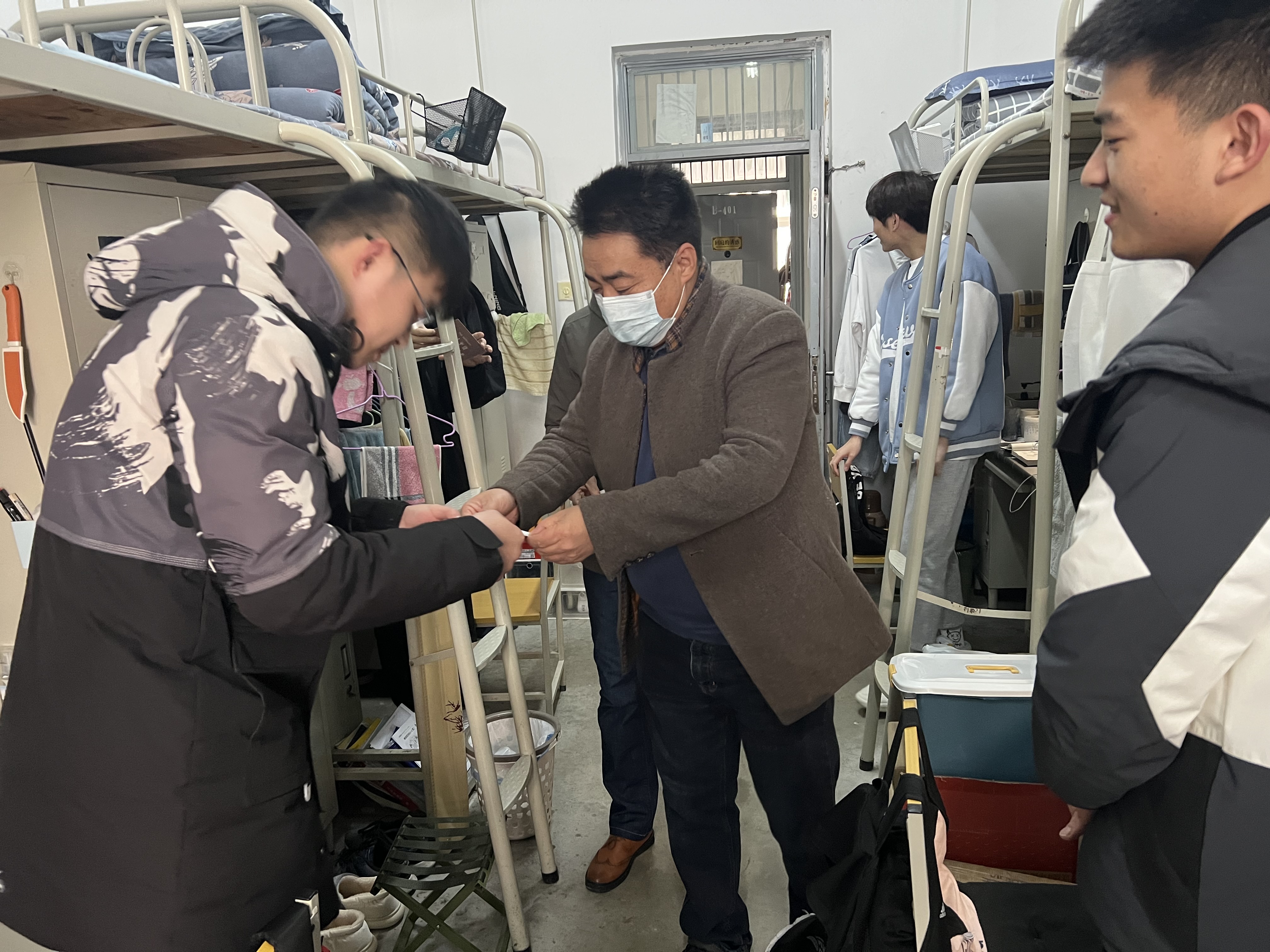 在宿舍,陈宣、文毅详细询问了考研员工的复习迎考情况,鼓励大家在最后冲刺阶段要保持定力、坚定信心、劳逸结合、调整心态、认真备考,以最饱满的状态参加考试。老师们为考研员工们送上了来自其他低年级学弟学妹们对学长考研祝福的“考研温暖卡”以及学习用品和解压玩具,并预祝大家实现考研梦想。同时还向同学们详细说明了疫情防控的最新要求,希望同学们积极配合有关工作,做好防护,遵守执行,关注自身身体健康,做自己健康第一责任人。
