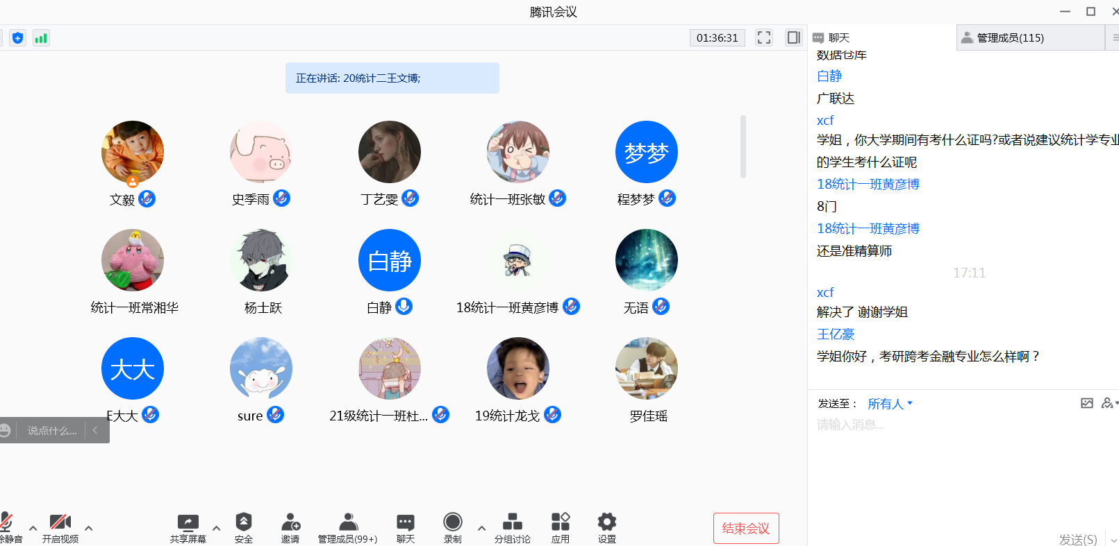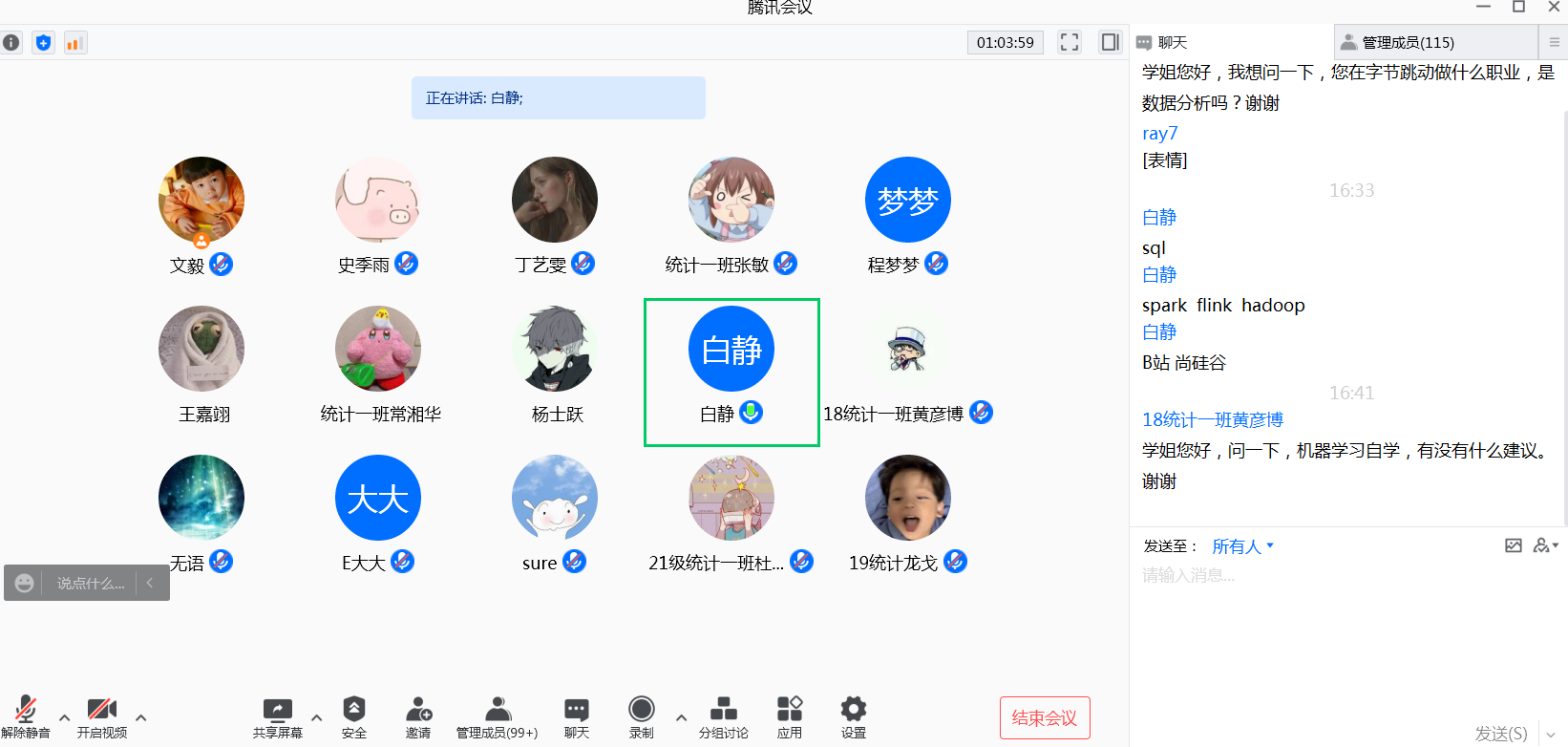 此次讲座以问答式进行,针对同学们提出来的假期如何寻找实习机会、专业应该考取的相关从业资格证书、跨专业考研、数据分析行业前景、就业途径前景等问题,白静给予了细致耐心的回答,并结合个人学习和工作经历等给同学们提出建议,建议同学们要对专业发展有信心,踏实专业学习,多拓展思路,多和师长沟通交流,共同提高个人能力,为个人发展奠定坚实基础。