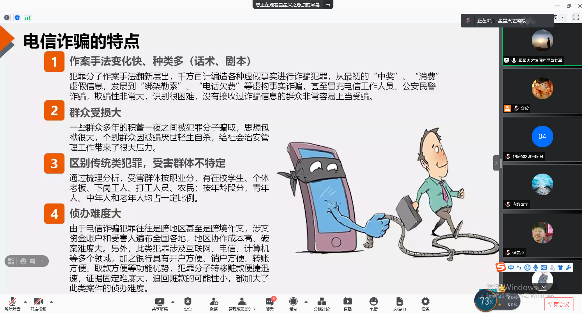 张琳警官以近期辖区电信诈骗受骗的相关数据向同学们说明了当前电信诈骗的严重性。从什么是电信诈骗,常见的电信诈骗手段,如何识别防范电信诈骗,上当后的补救措施等四个方面,具体分析了网络兼职返利刷单、网贷、冒充熟人诈骗、购物退款、游戏类诈骗、网络赌博等各种类型的诈骗方法和防范措施,讲解中结合同学们喜闻乐见的短视频形式,引起同学们阵阵共鸣。