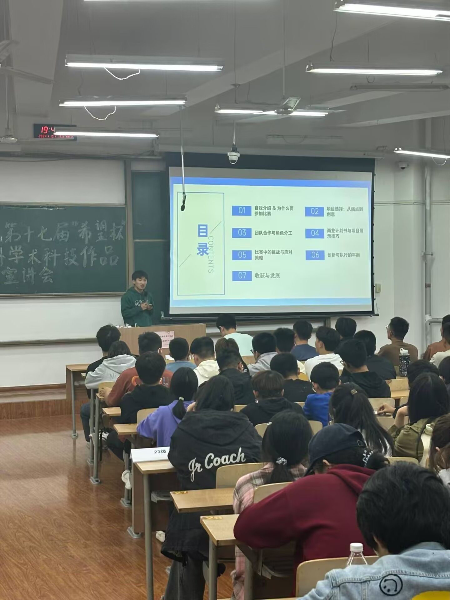 会上,微电专业获得过中国国际老员工创新大赛国家级铜奖、第十四届全国老员工电子商务“创新、创意及创业”挑战赛陕西赛区省级一等奖等奖项的李梦阳同学详细介绍了“希望杯”的历史、参赛途径及严格规则。微电专业获得过全国数学建模省级一等奖、第十四届全国老员工电子商务“创新、创意及创业”挑战赛陕西赛区省级一等奖等奖项的周鑫同学结合参赛竞赛进行了补充说明,使同学们对“希望杯”竞赛有了更深入的理解。李梦阳、周鑫两位经验丰富的同学享了他们的参赛心得,强调了竞赛的重要性,提醒同学们要平衡好学习与竞赛的关系,鼓励大家勇于突破自我,积极锻炼创新与实践能力。在答疑环节中,同学们积极提问,两位同学则耐心细致地一一解答,现场气氛活跃。