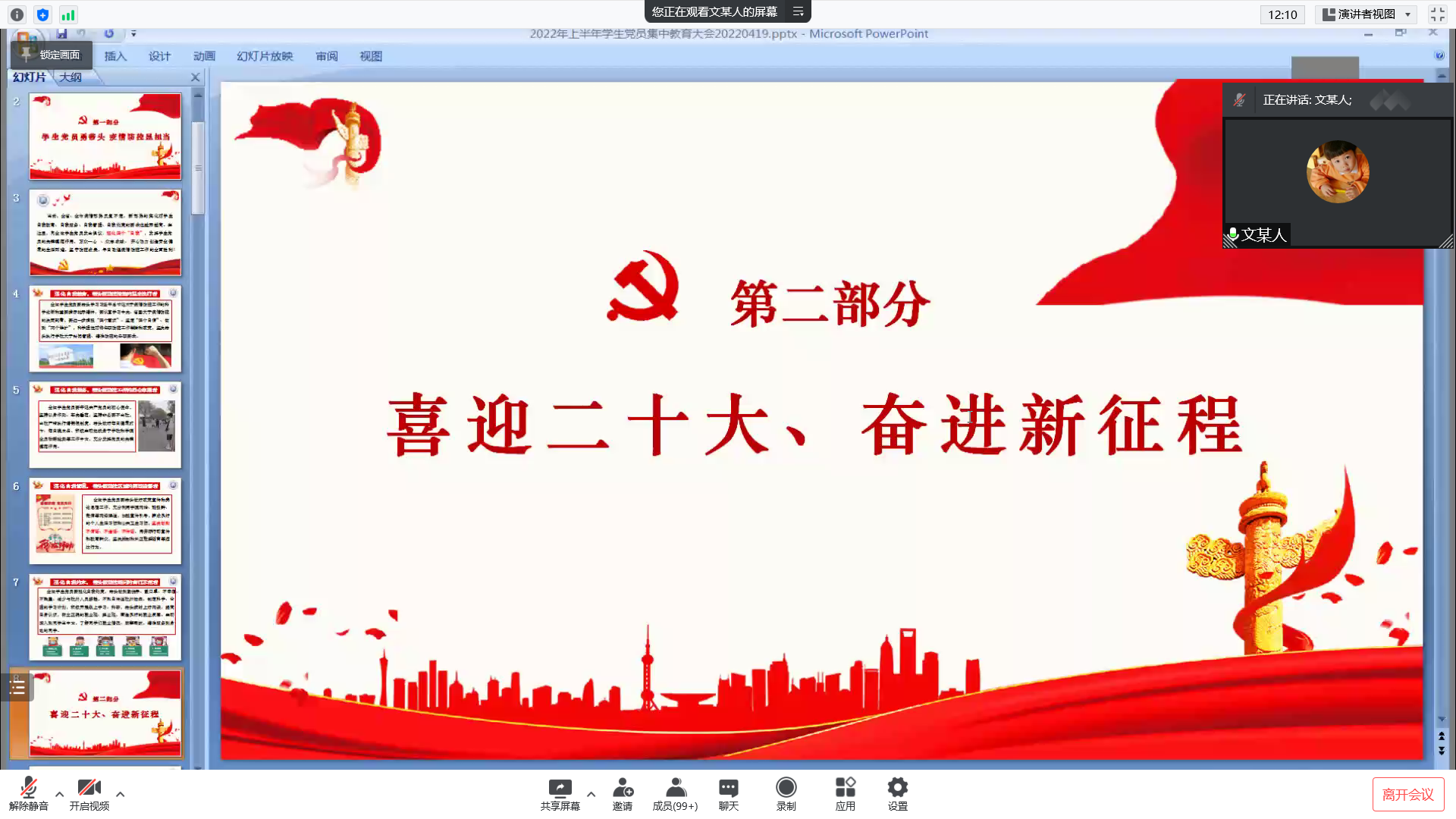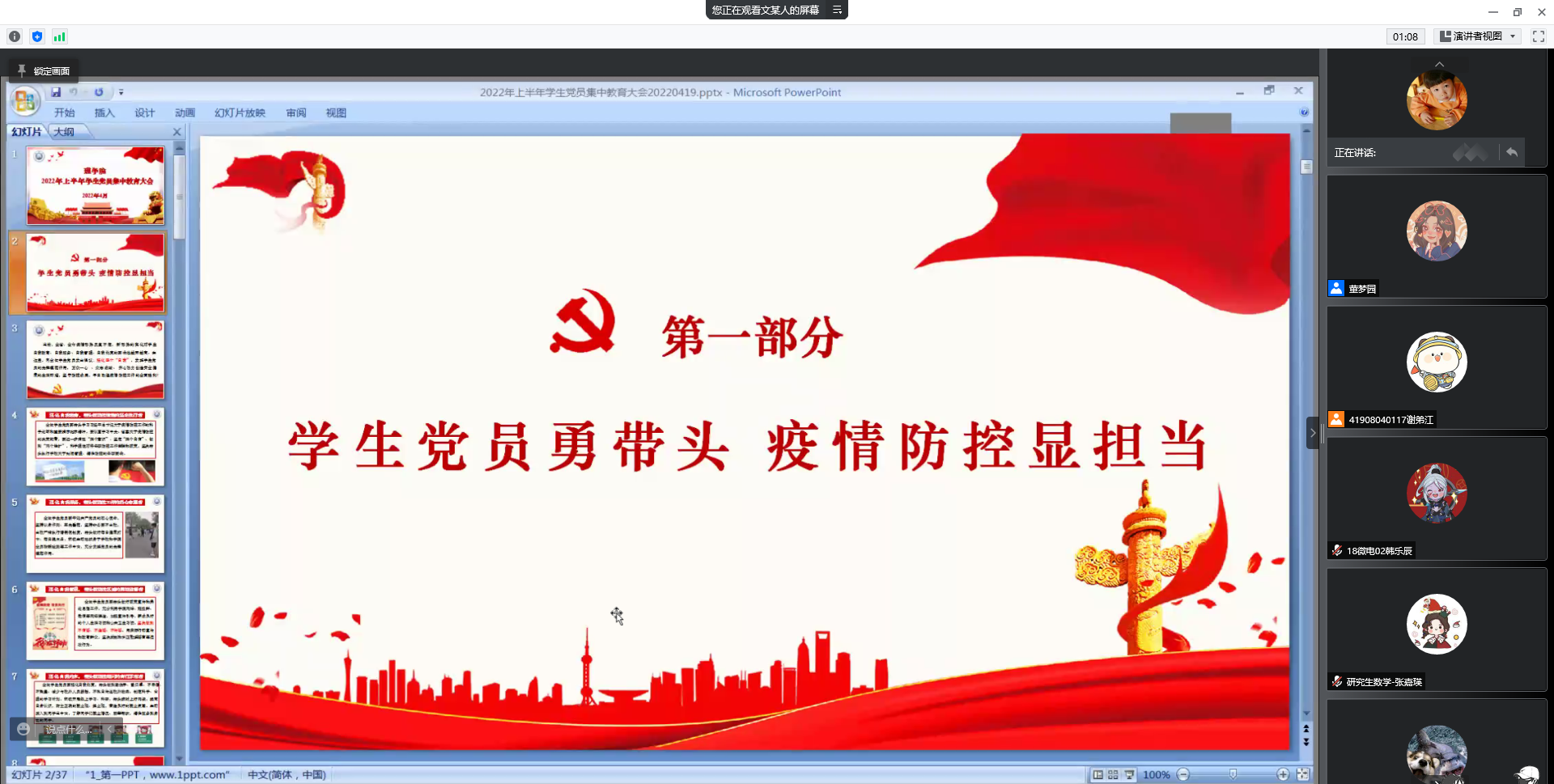 会上,公司党委委员、学工办主任文毅以党课的形式对全体员工党员进行了集中教育。针对目前新冠疫情散发多发和公司执行相关管控规定的实际情况,他以“员工党员勇带头、疫情防控显担当”为题向同学们发出倡议:一是强化自我教育,科学理性对待各项防控工作举措和政策,坚决带头执行校院两级精准防控的各项要求;二是强化自我服务,坚持以身作则、率先垂范,积极主动投身各项工作,充分发挥党员的先锋模范作用;三是强化自我管理,带头做好各项政策宣传,坚决做到不信谣、不造谣、不传谣,坚决抵制和纠正散播谣言等行为;四是强化自我约束,制定科学、合理的学习计划,积极开展线上或线下学习、科研,树立正确的就业观、择业观,营造良好的学习生活氛围。接下来,他以“喜迎二十大、奋进新征程”为题带领全体党员回顾了2021年党和国家取得了一系列伟大成绩,对党的十九届六中全会精神再次进行了领学,希望同学们努力锤炼自身、不断提升综合素质,在学习生活中不断完善,用实际行动迎接党的二十大胜利召开。
