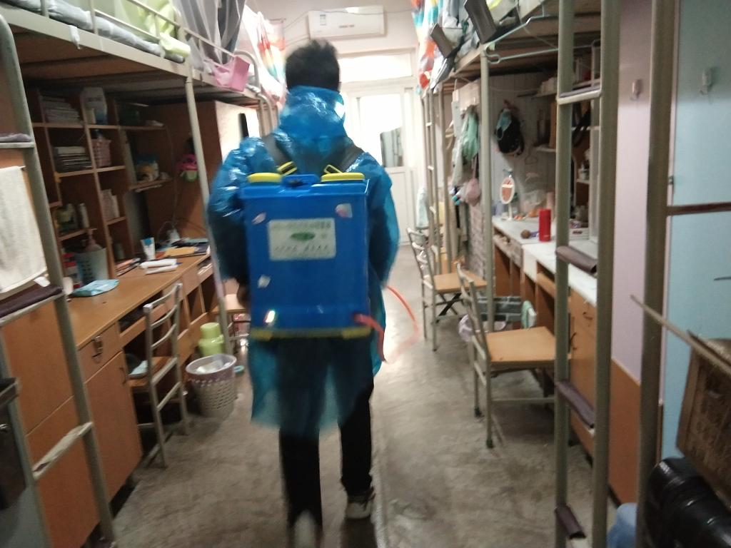 消杀前,公司准备了一次性雨衣、电动喷雾器、84泡腾片、一次性口罩等物资,并对参与人员进行了集中培训和分组,要求参与人员佩戴标牌,履行登记手续,严格配比消毒液,认真对宿舍地面、门把手进行消杀。消杀时,参与人员按照分工,分别到1号、3号、4号、5号、7号、8号、9号员工公寓开展工作,开门、消杀、锁门等环节配合紧密,确保消杀到位,不留死角。工作中,同学们不计劳累,背负20多斤重的电动喷雾器时争先恐后;负责开门的党员在开门时都会认真确认宿舍是否有人,再进行开门;负责锁门的党员锁完门后都会用力推下门,确认门锁好。参与人员细致热心的工作得到了同学们的一致赞扬。