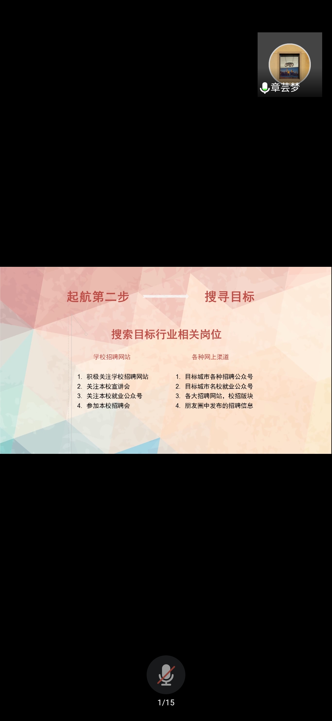 讲座中,文毅简单介绍了2020届毕业生章芸梦、任博权的基本情况。概率论与数理统计专业毕业生章芸梦以《筑梦 起航》为题分享了自己从研二到研三求职的经历,从自身工作和继续深造的抉择、时间的安排、目标行业的选择、简历的制作、岗位的确定、笔试和面试准备等方面讲起,重点就简历的制作、就业心态的调整和相关求职网站对同学们进行了讲述,并预祝2021届毕业生顺利起航。物理测试理论与技术专业毕业生任博权以《找工作是一场持久战》为题进行了分享,从个人定位、简历制作、就业信息收集、时间安排等方面分享了自己的求职历程,告诉同学们要提早选定工作方向,做好简历,发动各种资源收集就业信息,统筹安排好学习与就业的关系,还讲述了自己边找工作边考博的经历,并祝学弟学妹们顺利找到心仪工作。参会同学还就关心的问题与毕业生进行了热烈交流。
