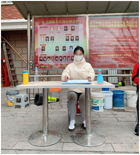 危难时刻看到同胞们的付出和牺牲,看到国家努力且不惜重金地救治人民,身为预备党员的她积极投身防疫工作,“出门受到限制,那就在小区出力吧!尽管力量薄弱,但能做点儿什么总是好的。”她是这样想着,也是这么做的。这次志愿服务让她体会到中国人民的团结,大家都积极响应政府少出门的号召,各行各业有条不紊的恢复正常生活,让她确切的感觉到了祖国的强大!