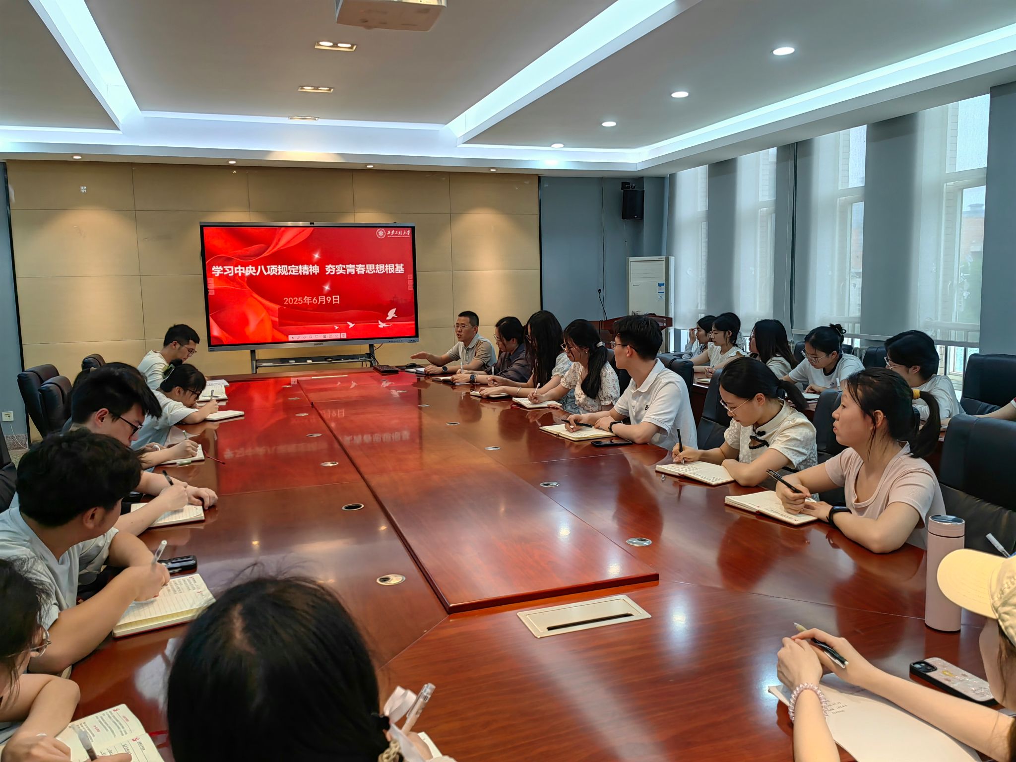 会上,文毅根据公司关于学风建设有关文件精神,强调学风建设是公司发展的重要组成部分,也是员工成长成才的关键所在,推动党建工作与学风建设深度融合是提升育人质量的重要环节,希望员工党员带头营造优良学风,以实际行动影响和带动身边师生;接着,文毅讲授了题为《学习中央八项规定精神夯实青春思想根基》的专题党课。他围绕深刻领会习近平总书记关于党的作风建设的重要论述、学习好运用党的十八大以来深入贯彻中央八项规定精神的成效和经验、推动深入贯彻中央八项规定精神学习教育走深走实三部分展开详细阐述,鼓励同学们要运用学习强国、共产党员网等平台载体加强政治理论学习,深入领会中央八项规定精神实质,弘扬和传承优良党风学风,严以律己,知行合一,在科研学习和日常生活中发挥好先锋模范作用。