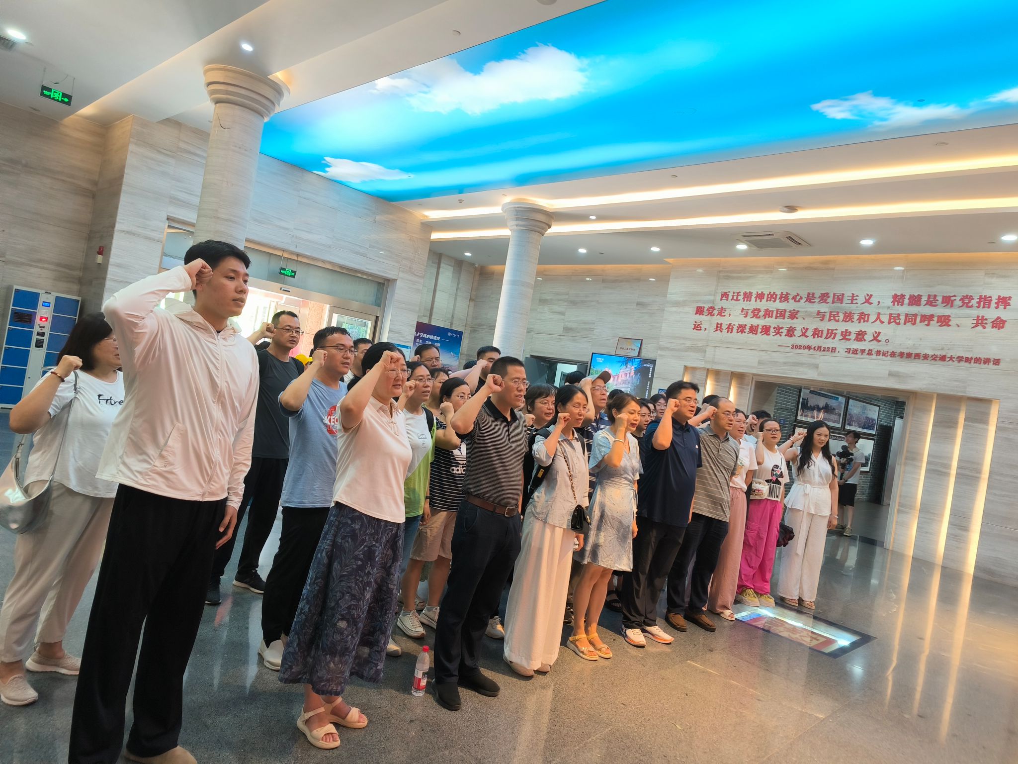 师生们在一幅幅珍贵影像、一件件历史实物中,沉浸式感悟老一辈交大人“胸怀大局、无私奉献、弘扬传统、艰苦创业”的西迁精神,接受了一次深刻的精神洗礼。在讲解员的细致引导下,大家先后步入“溯源”“西迁”“致远”三个主题展厅,开启了一段跨越时空的历史对话。“溯源”展厅内,详实的史料清晰展现了交通大学自1896年创建以来的发展脉络,从南洋公学到交通大学,从浦江之畔到黄土地上,公司的每一步发展都与国家命运紧密相连。步入“西迁”展厅,时光仿佛倒流回那个激情燃烧的年代。展柜中,一封封泛黄的家书静静陈列,字里行间满是交大人对家人的思念与对祖国的赤诚。在“致远”展厅,一组数据令人震撼:西迁以来,西安交通大学为国家培养了30多万名毕业生,其中一半以上扎根西部,为国家建设特别是西部发展作出了重要贡献。墙上展示的一张张杰出员工照片中,既有“两弹一星”功勋专家,也有行业领军人才,他们的事迹生动诠释了西迁精神在新时代的传承与发展。参观现场,全体师生党员还一起重温了入党誓词。