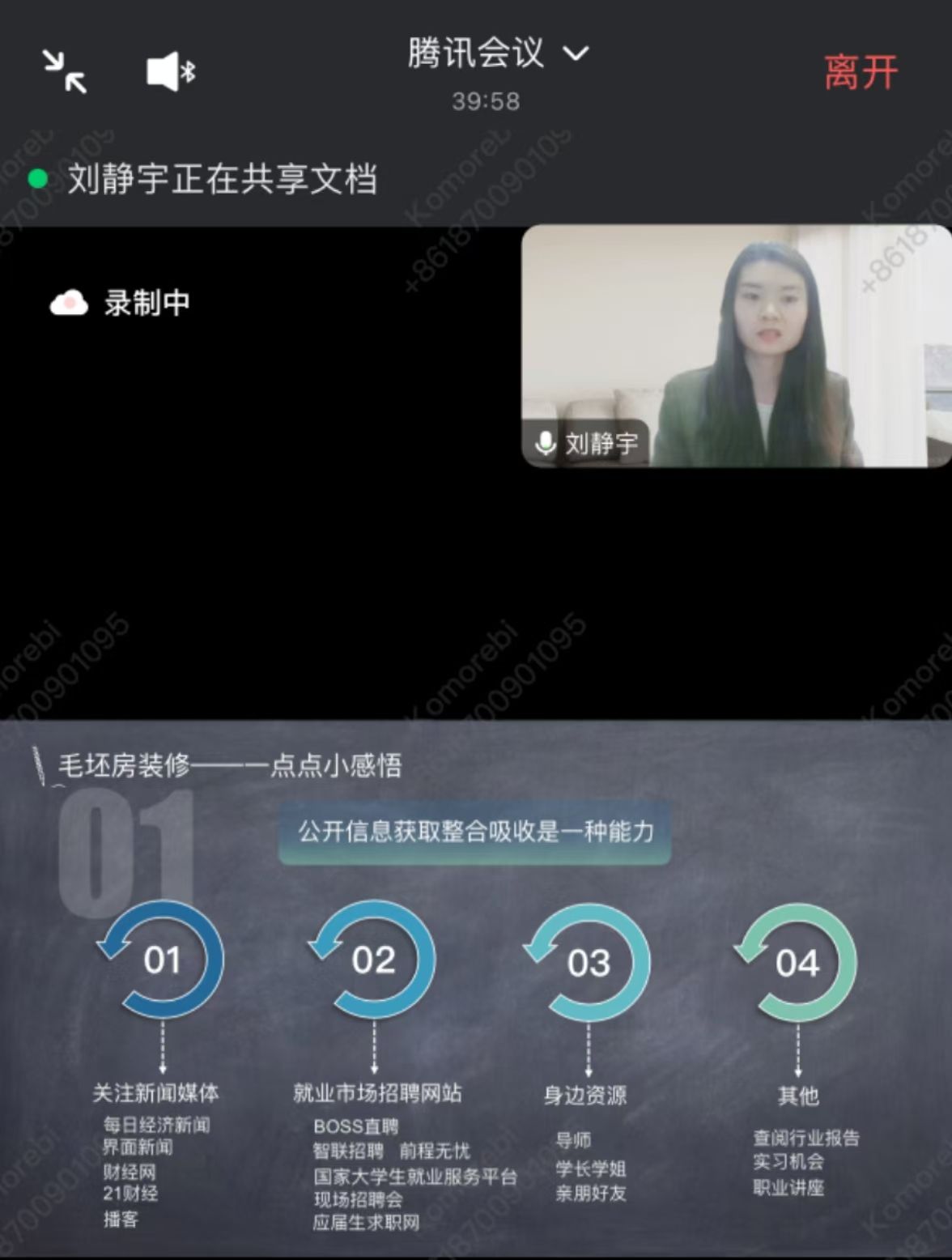 她还从公开信息获取整合吸收的能力方面做了强调,告诉大家要关注新闻媒体、就业市场和招聘网站、身边资源。最后她还结合自身希望同学们以悦己悦人的态度去读书学习,切勿“明日复明日,明日何其多”;大环境竞争激烈,切勿只看到眼前环境“掩耳盗铃”;祝福大家“鲜衣怒马少年时,不负韶华行自知”。讲座最后,刘静宇员工还耐心细致的回答了同学们的提问。
