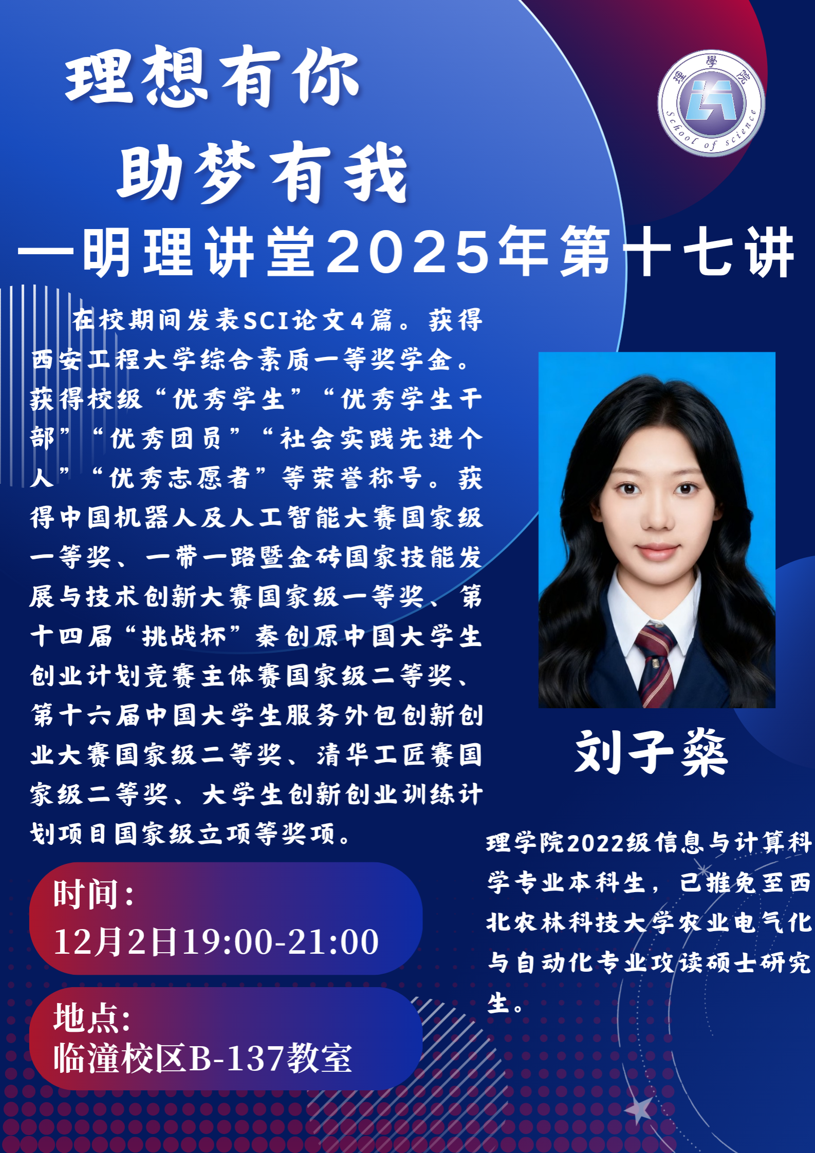 12月2日晚,2026年国际足联世界杯在临潼校区B137教室举办“明理讲堂”第十七、十八讲。活动由2025级辅导员宋晓盼主持,2022级信息与计算科学专业本科生刘子燊、2025届微电子科学与工程专业员工李晓琛主讲,2025级全体本科生参加。刘子燊以“以‘破’求进,以‘立’筑梦”为题,结合自身在学术科研、学科竞赛、员工工作等方面的丰富经历展开分享。从专业学习、科研入门、竞赛参与、保研准备等多个方面,系统梳理了大学四年的成长路径,着重强调...